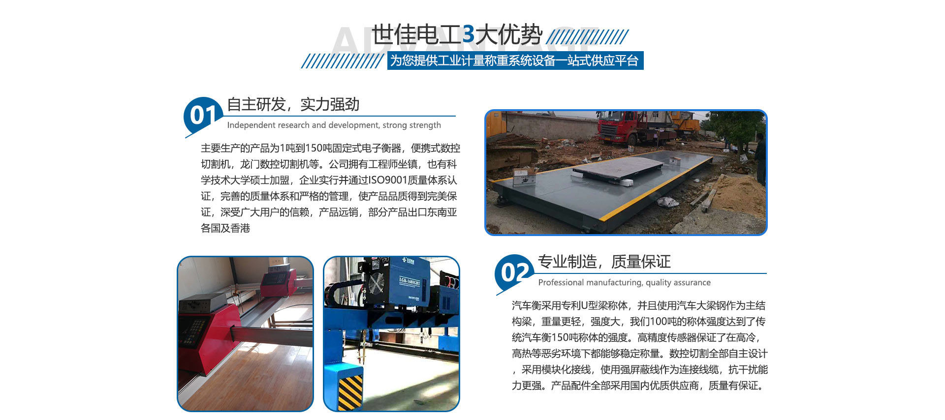 關(guān)于我們合肥世佳電工設(shè)備有限公司是生產(chǎn)、銷售工業(yè)自動(dòng)化設(shè)備。主要生產(chǎn)的產(chǎn)品為1噸到150噸固定式電子衡器,便攜式數(shù)控切割機(jī),龍門數(shù)控切割機(jī)等。公司擁有工程師坐鎮(zhèn),也有中國科學(xué)技術(shù)大學(xué)碩士加盟,完善的質(zhì)量體系和嚴(yán)格的管理,使產(chǎn)品品質(zhì)得到保證,深受廣大用戶的信賴,產(chǎn)品各地可售,部分產(chǎn)品出口東南亞各國及香港,數(shù)控切割設(shè)備也在安徽處于前列。我們并不滿足現(xiàn)在所取得的成就,公司繼續(xù)加大科研投入,正在和中科大物理研究所科研人員共同研究開發(fā)下一代衡器控制儀表,希望以技術(shù)作為突破口,將公司做大做強(qiáng),為中華崛起盡自己一份綿薄之力。歡迎廣大客戶來廠參觀訂貨考察。